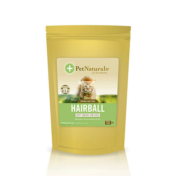 Nutraceúticos Hairball Pet Naturals, un suplemento alimenticio para gatos adultos de todas las razas que ayuda a mantener una óptima salud del pelaje y control de bolas de pelo.
